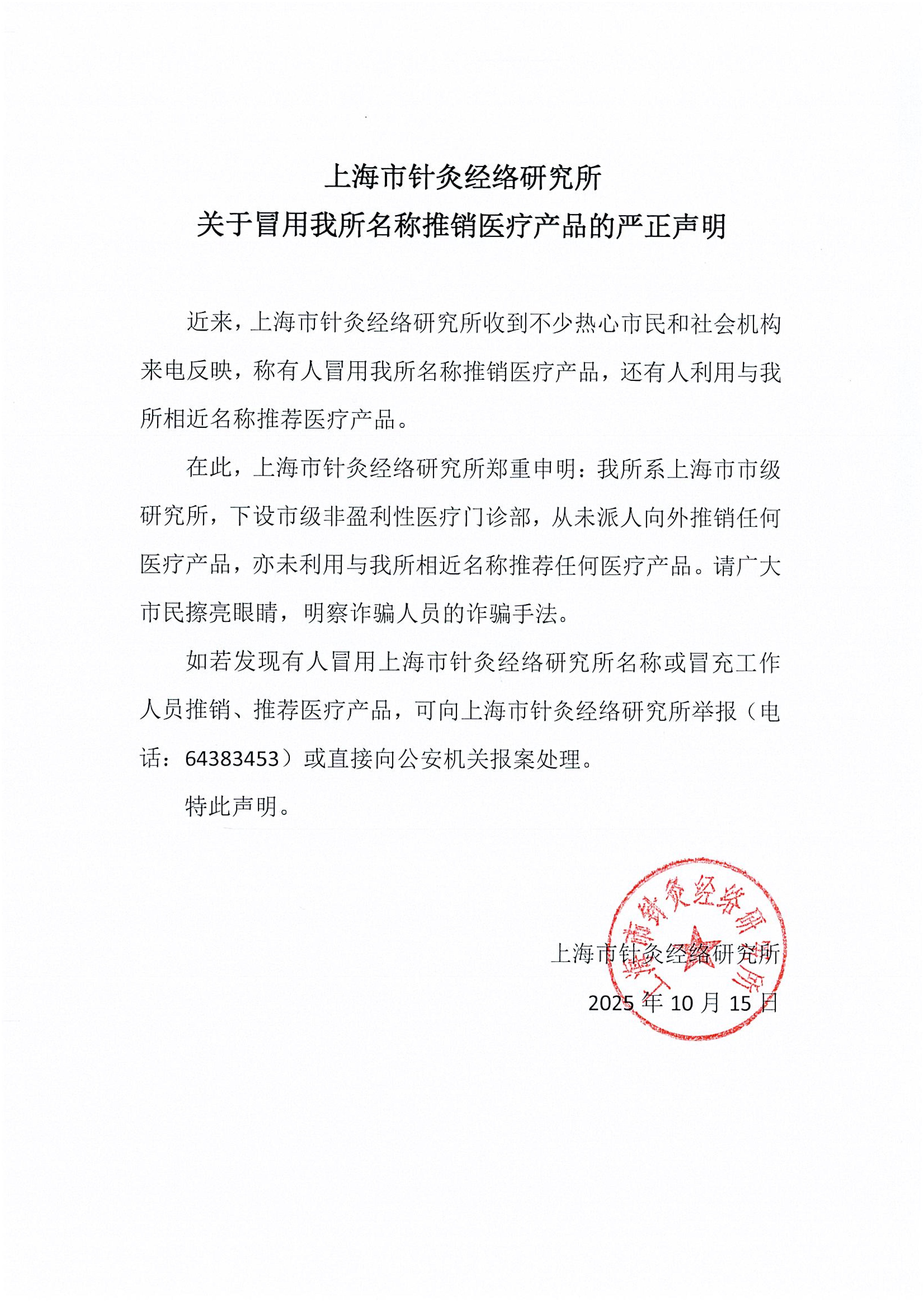 上海市针灸经络研究所关于冒用我所名称推销医疗产品的严正声明